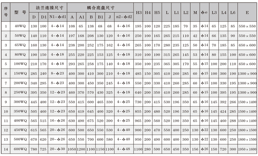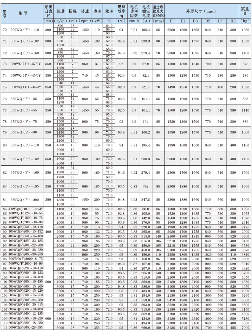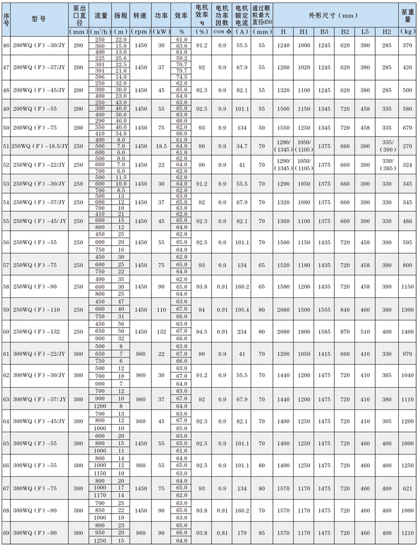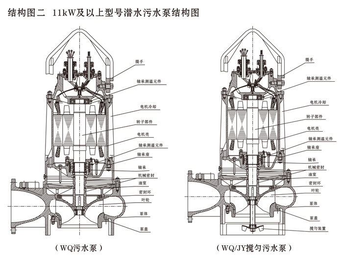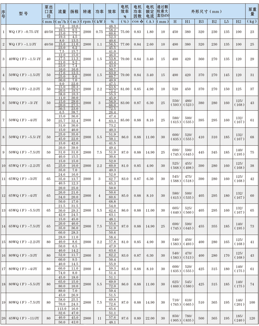為了使WQ(F/JY)系列潛水污水泵以更好的可靠性、更高的機組效率服務于客戶,在總結25年生產制造該系列泵的經驗積累的基礎上,再一次更新優化了水力模型,創新機械密封、軸承結構,采用優質電機材料,根據使用環境條件,18.5kW及以上泵對電機循環冷卻,保證可靠性。全系列共111個基本規格,通過使用原型葉輪和改型葉輪及其切割,在型譜性能范圍內,可提供恰當滿足用戶所需要的任意流量、揚程工作點的水泵。